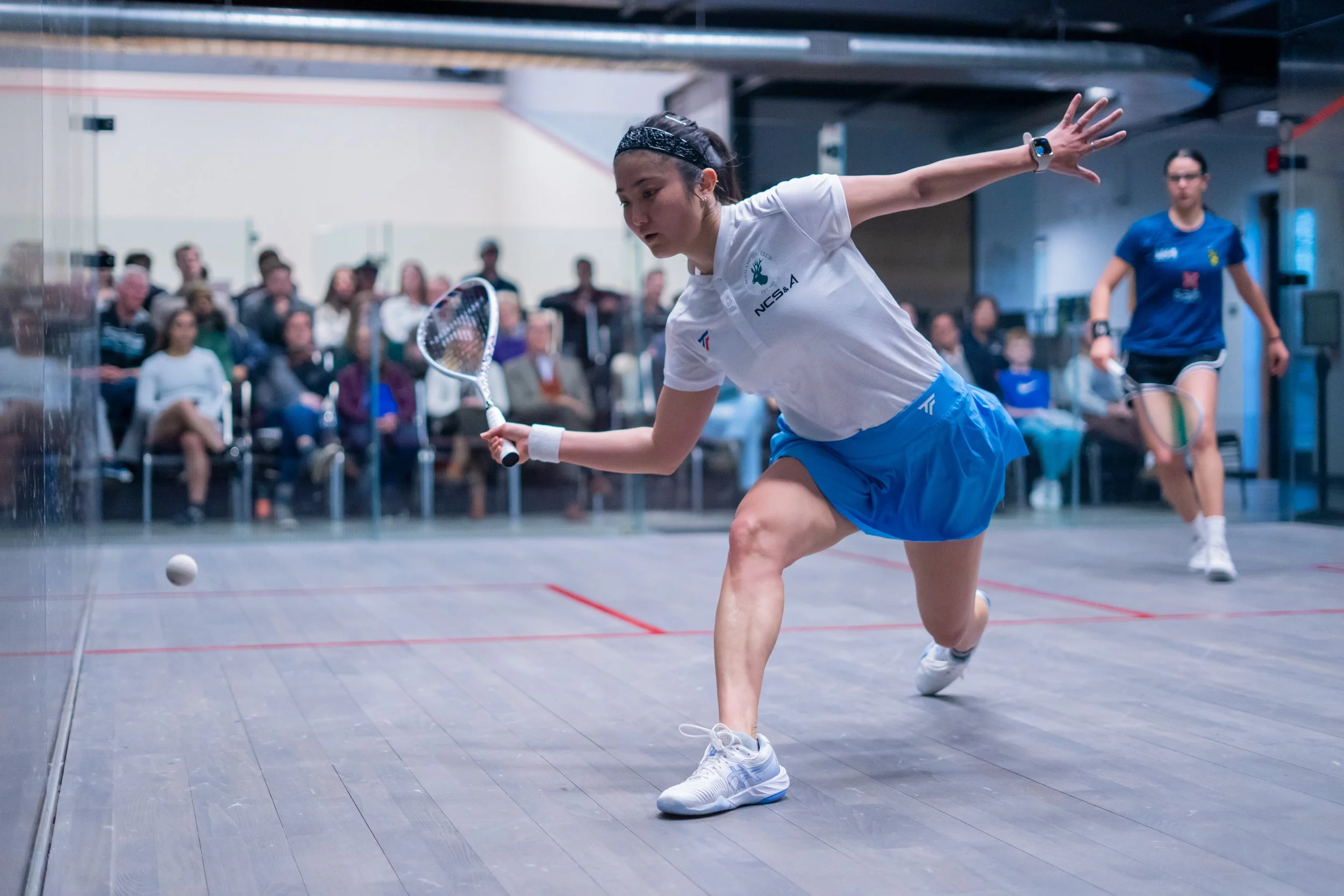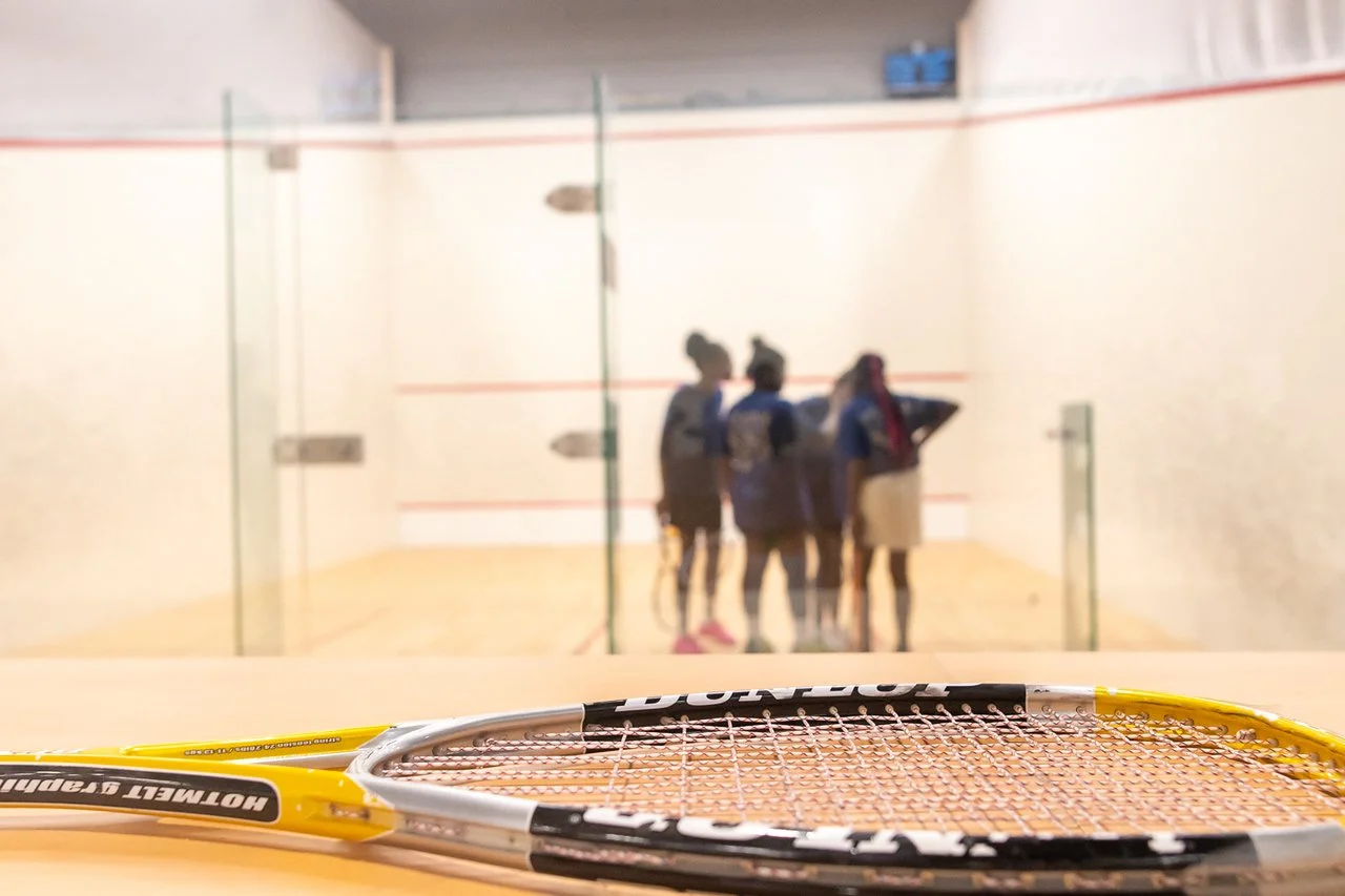 Squash is a game played with racquets and a hollow rubber ball. Players take turns striking the ball against the front wall, maneuvering around one another after the ball returns from the front wall and before it bounces on the floor twice. Each sequence of players taking turns hitting the ball is called a “rally” with the objective of earning points by withstanding your opponent’s strikes/making it impossible for your opponent to return the ball.